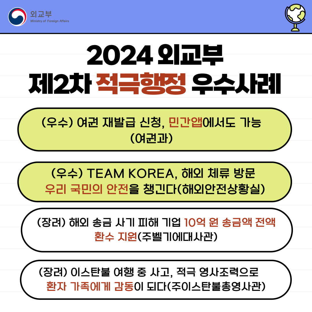 2024년도 제2차 외교부 우수사례 공모전을 통해 선발된 우수사례 4건을 소개합니다.
